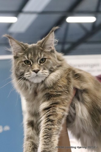 Denne frøkna har tatt Norge med storm, hun er en aldeles herlig jente. Hun står til 10 på alt 🙂 I utstillingsringen gjør hun det over all forventing, hun fremstår som en særdeles flott jente. Hjemme er denne dama veldig fin, snill og grei. I utstillingsringen har hun derimot ikke lyst til å være, hun blir rett og slett sur. Nå er hun allerede Grand International champion, så det får foreløpig bli med det. Kanskje etter hvert så roer hun seg, hormonene faller på plass og vi kan fortsette utstillingskarrieren. Alt i alt så har hun mer en nok klart å vise at hun er av en særdeles god kvalitet. Hun har alt en skulle ønske seg, bort sett i fra perfekte hofter. Skulle gjerne sett at de var bedre, men det er som det er. Etter å ha veid frem og tilbake, har jeg landet på å benytte henne videre i mitt oppdrett. Det hele handler for min del om å gjøre bevisste valg. Hun er hel V ellers, ikke vært syk en dag og resten av helsetestene hennes er uten anmerkning. Hun blir selvfølgelig paret med hannkatt som har frie hofter.